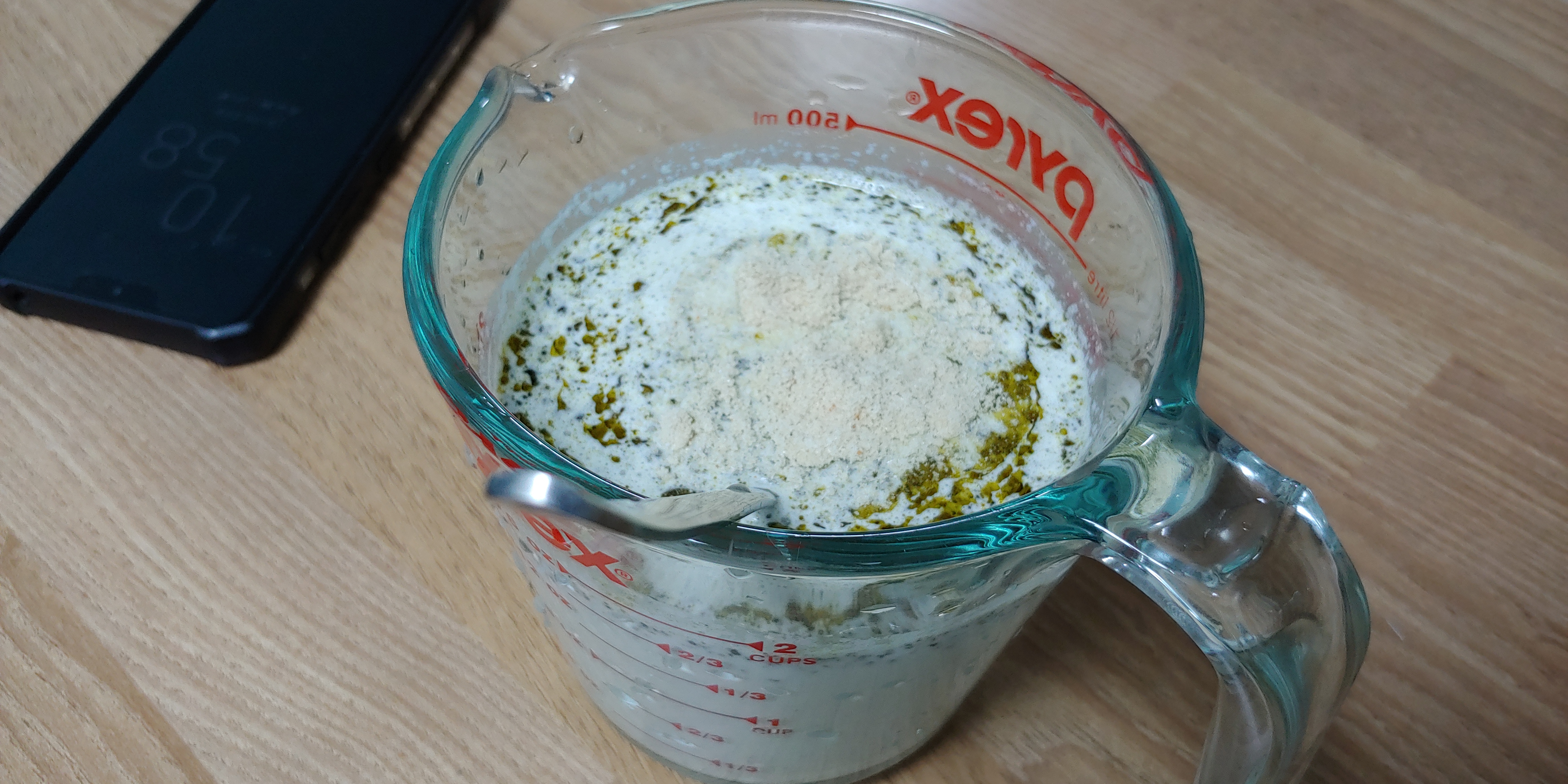 2. 생크림에 바질페스토, 마늘 간 것, 치킨스톡을 넣어 준비해둔다.