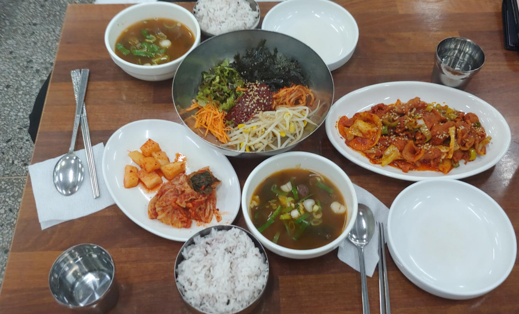 주문을 하고 반찬을 가져오니 금세 상을 차려주셨습니다. 너무 맛있어 보이죠~~!!!🙉 비빔밥을 주문했더니 선지해장국이 같이 나왔어요;; 1인분 가격에 3인분 먹기로군요 ㅎㅎ;;; 심각하게 잘 나오죠.