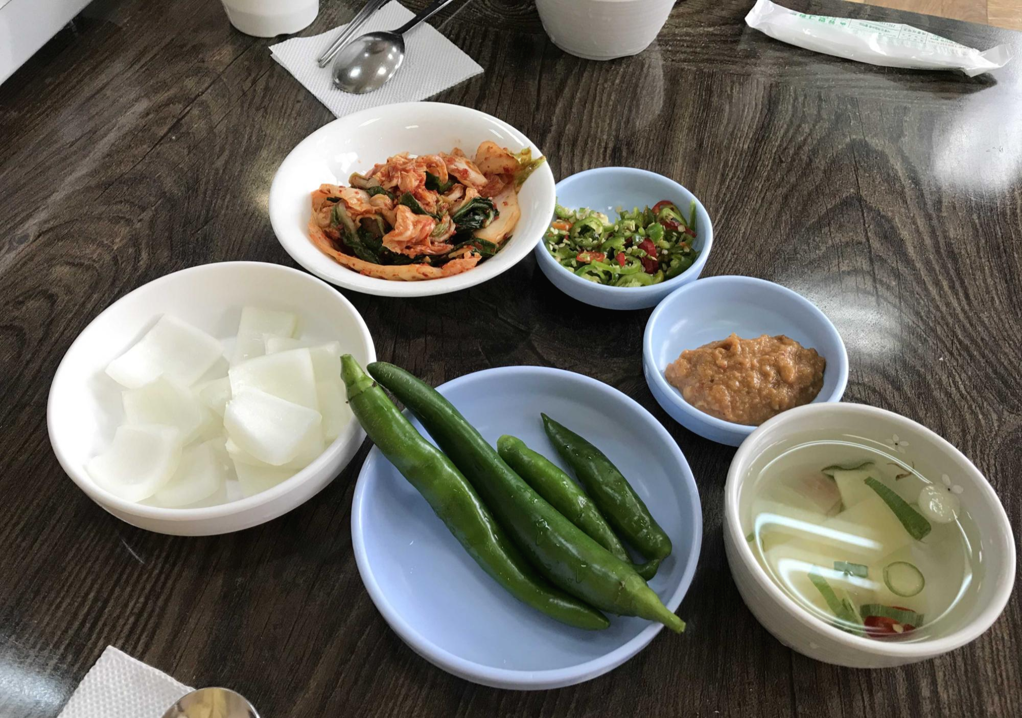 기본 상차림입니다. 김치가 짜지 않으면서 시원하고 맛있었습니다. 직접 담그신 것 같아요.