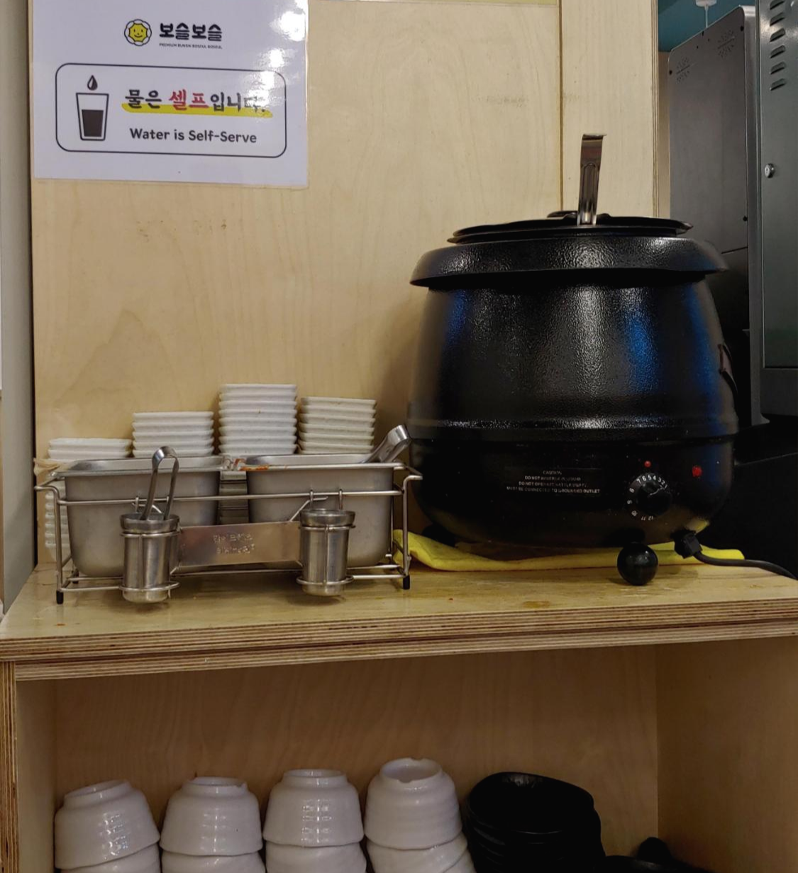 주문한 김밥이 나올 때까지 셀프바에서 김치, 단무지, 김칫국을 세팅했어요.