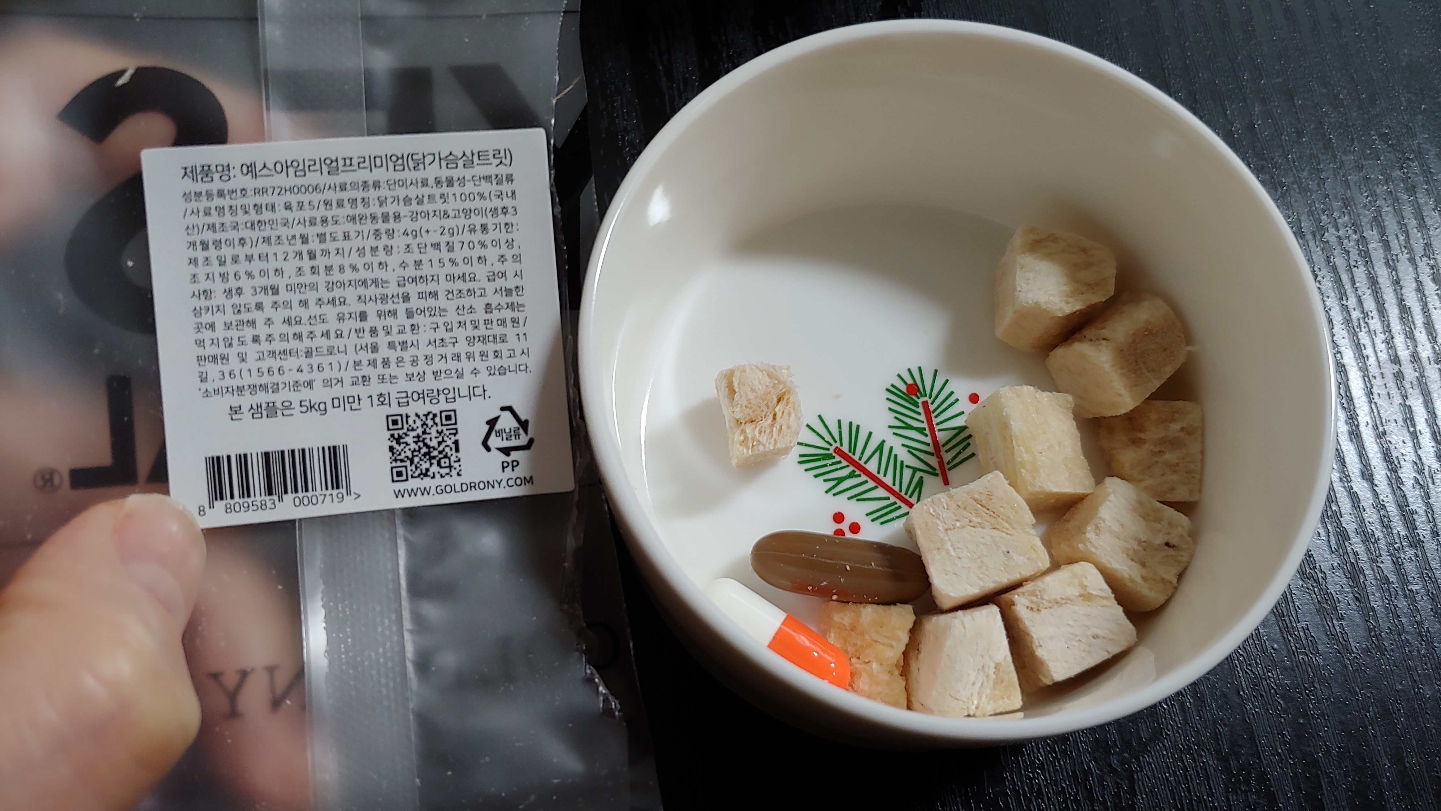 홍이는 매일 두 종류의 알약을 복용해야 해서 보상으로 어쩔 수 없이 매일 간식을 주고 있어요.제 기준 1회 급여하기 딱 좋은 양인 것 같아요.