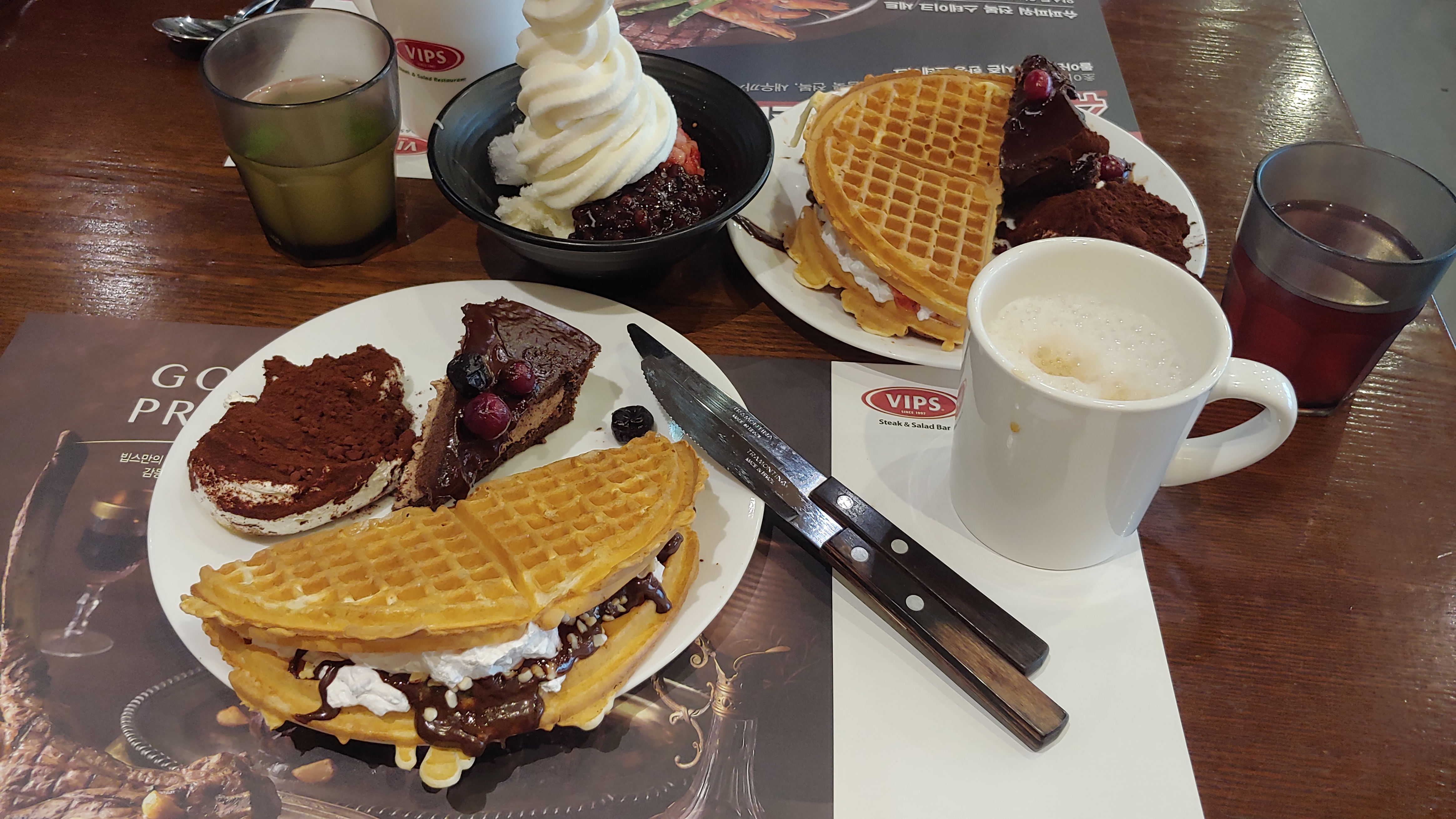 이거 먹고 한동안 좀 힘들었어요. 너무 달아요. 제가 와플에 생각 없이 생크림과 잼을 들이붓긴 했지만 와플만 먹어도 달던데요? ㅠㅠㅠ 아이스크림에 에스프레소 부어서 아포가토까지 해 먹어야 뷔페 좀 다녀왔다~하는데 브레이크 타임에 임박해서 간 거라 30분 만에 후다닥 먹고 속이 느글느글해가지고 그냥 나왔네용 ㅋㅋㅋ 다신 없을 경험 ㅋㅋㅋㅋ