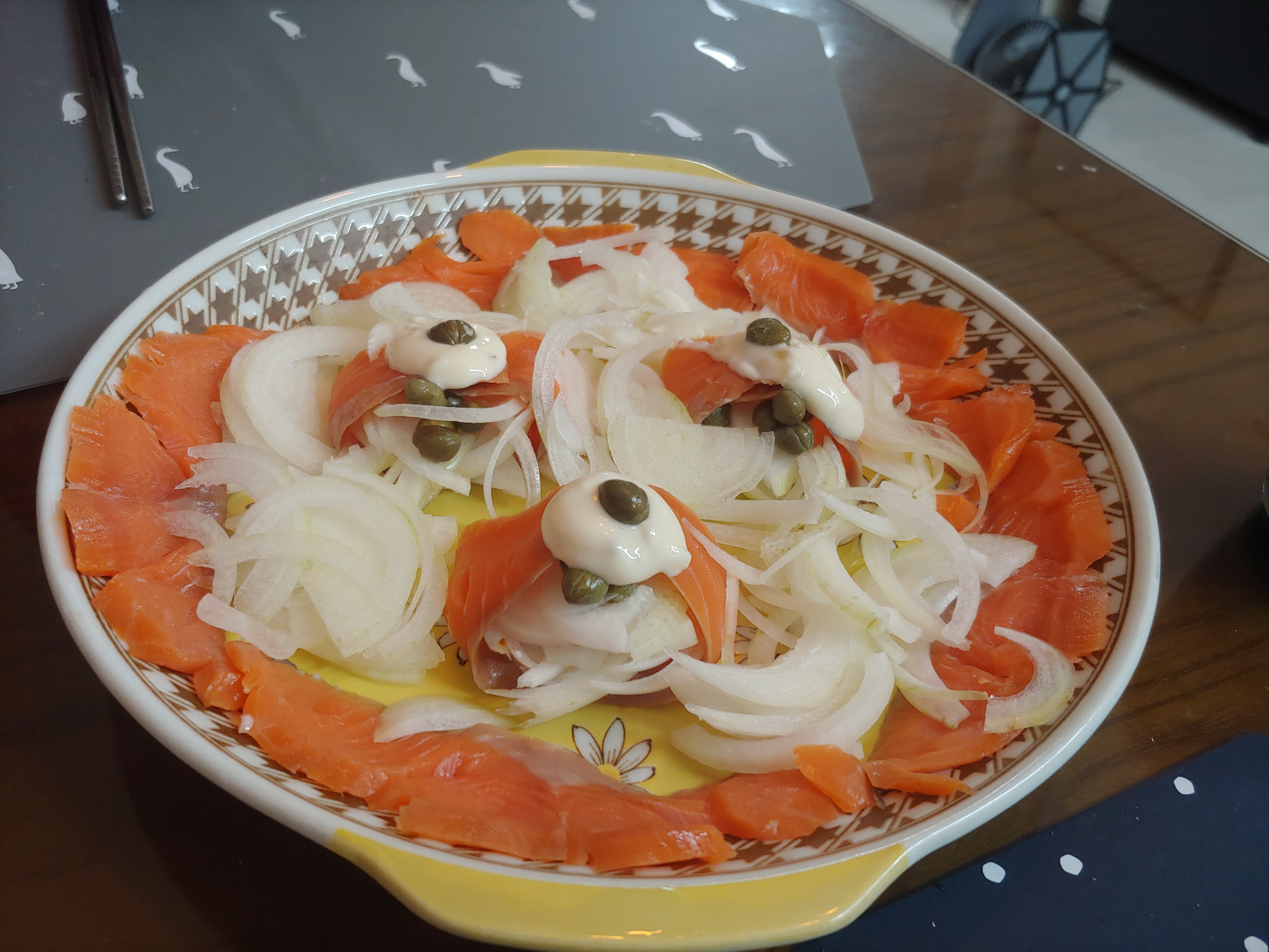 연어는 그냥 먹어도 맛있는데 양파와 홀스래디쉬 소스, 케이퍼를 곁들이면 훌륭한 샐러드가 되죠.