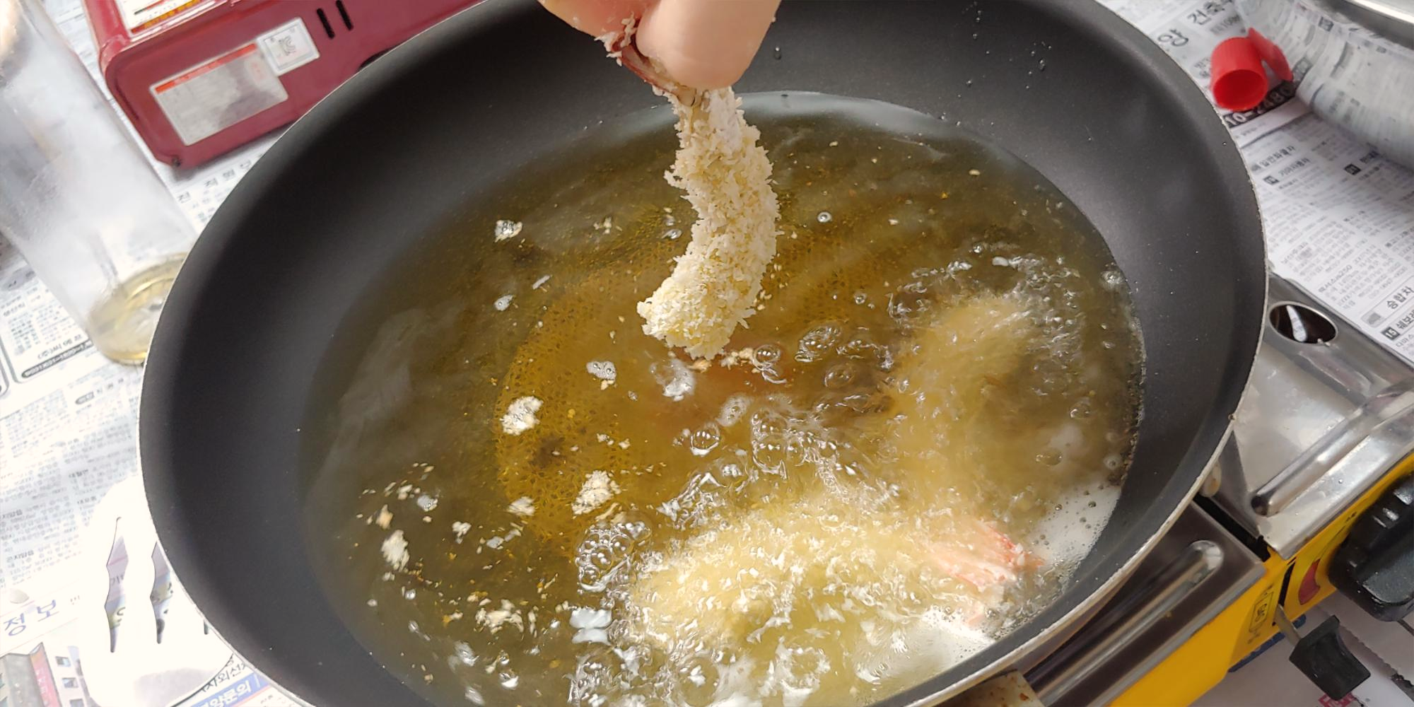 3. 달궈진 기름에 새우를 튀겨준다.