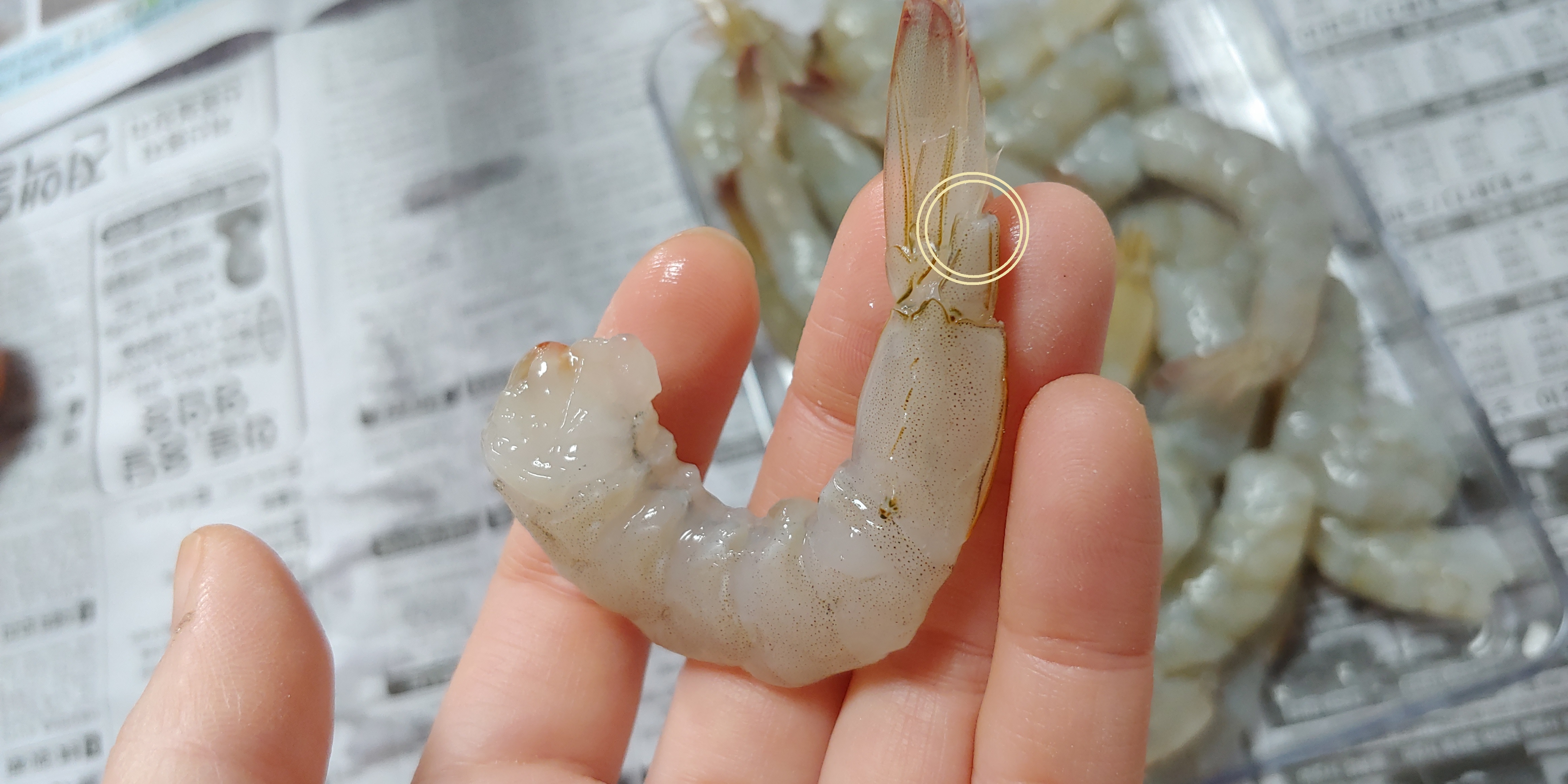 (4) 다리와 껍질을 뜯어낸다. 꼬리를 남겨두고 싶으면 맨 마지막마디 껍질은 제거하지 않는다.
