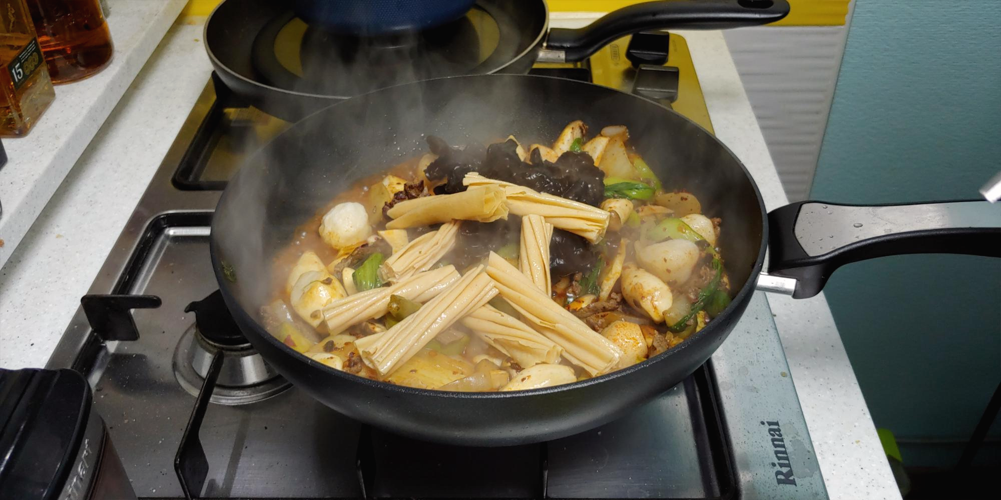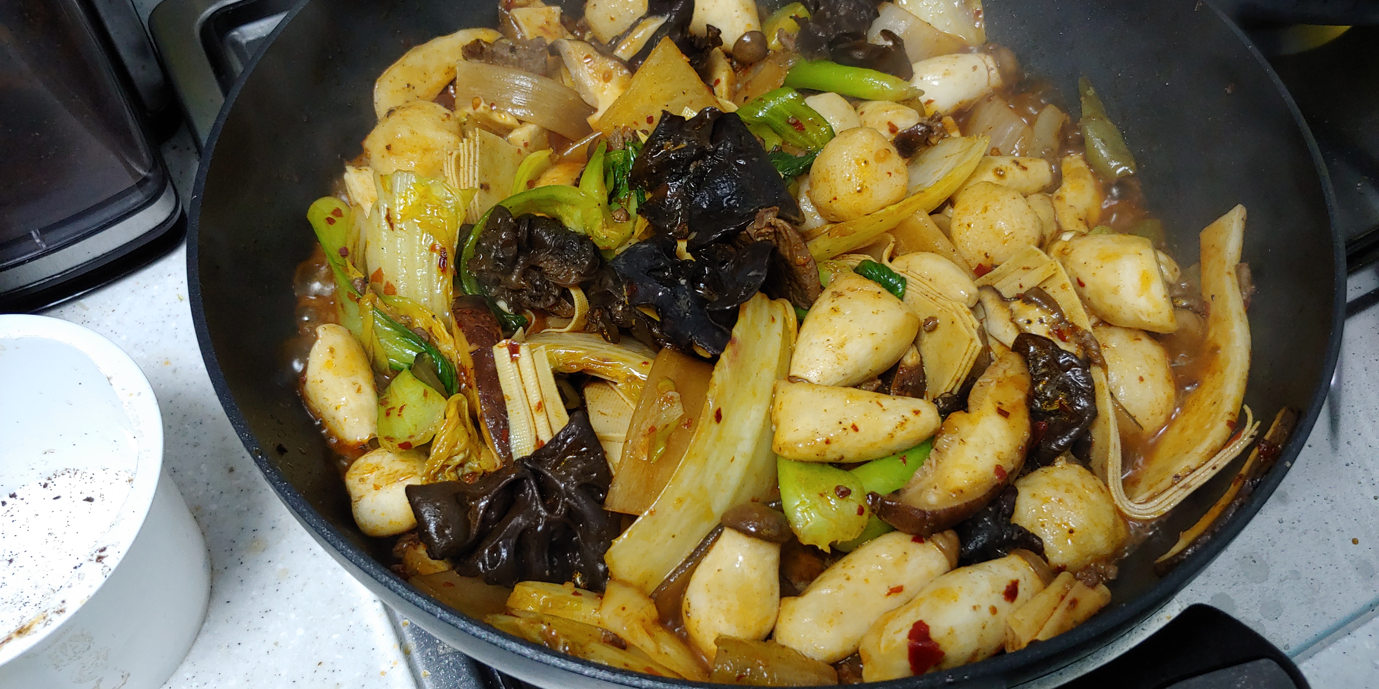 버섯, 오징어 볼, 건두부를 넣고 소스는 조금씩 여러 차례 나눠 부어준다.