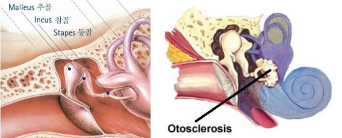 전음성난청의 또 다른 중요한 원인은 청소골에 생기는 질병인 이경화증입니다. 이경화증은 귓속에 있는 등자뼈의 아랫부분에 해면 모양의 뼈조직이 형성되는 병입니다. 이렇게 되면 등자뼈가 제대로 움직일 수 없게 되어 진동을 내이로 전달하지 못하게 됩니다. 이경화증은 유전되는 것으로 보고 있습니다.