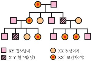 X'X'인 경우 : 양쪽 모두의 X염색체에 혈우병인자를 물려받은 여자는 매우 드물지만 혈우병 환자가 될 수 있고, 혈우병 여자가 아들을 낳으면 반드시 혈우병 환자가 됩니다.