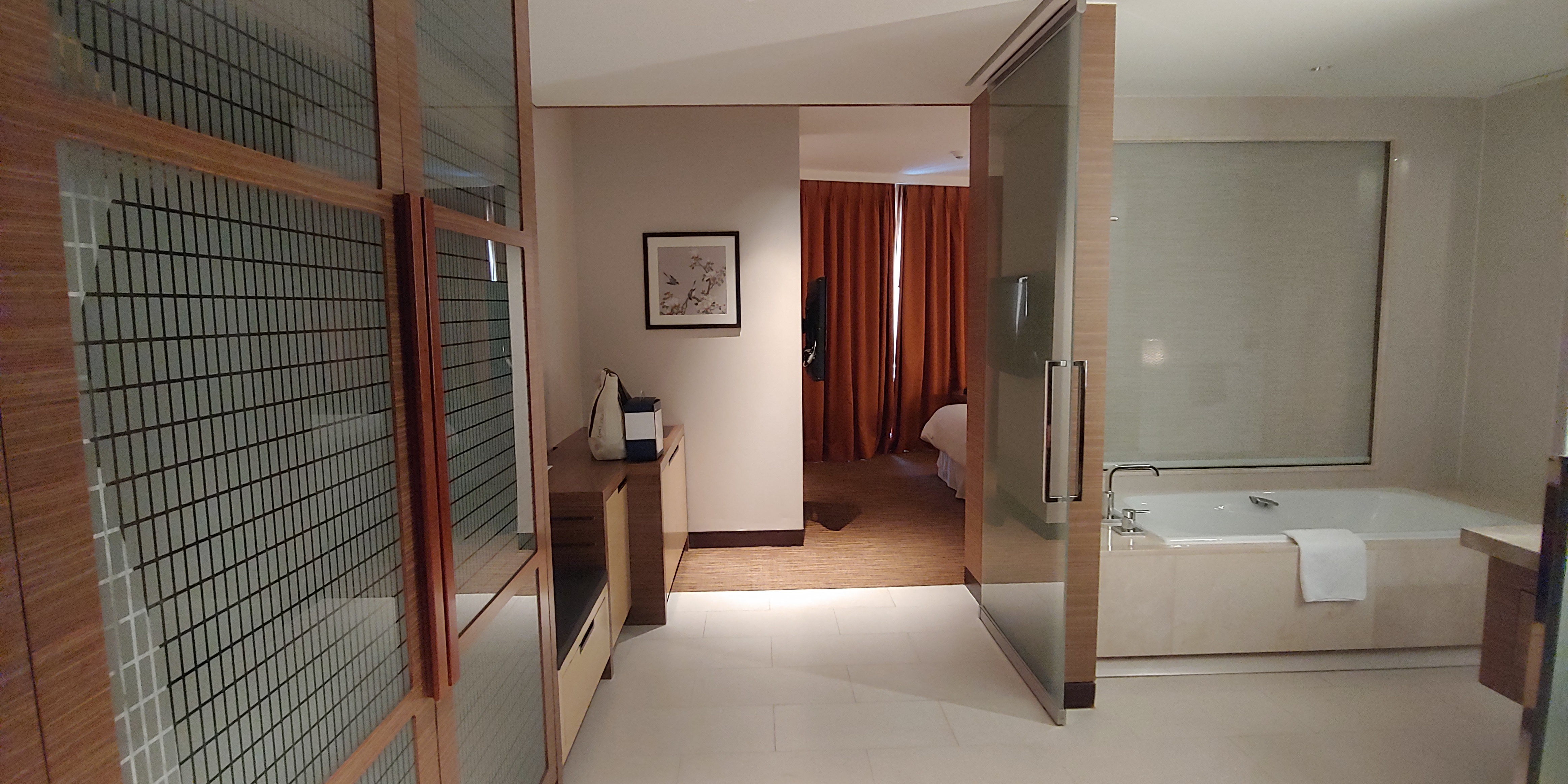 욕실 및 화장실은 불투명 유리문으로 개폐할 수 있고 안에 화장실과 샤워부스가 독립되어있습니다. 욕조 옆에 자동 블라인드가 있어 방 전체가 탁 트인 것처럼 보이면서도 프라이빗하게 이용할 수 있습니다. 욕조는 혼자 들어가면 적당한 사이즈였습니다. 저는 키큰이 이기 때문에 조금 더 길이가 낭낭했으면 좋겠다는 생각은 했습니다.