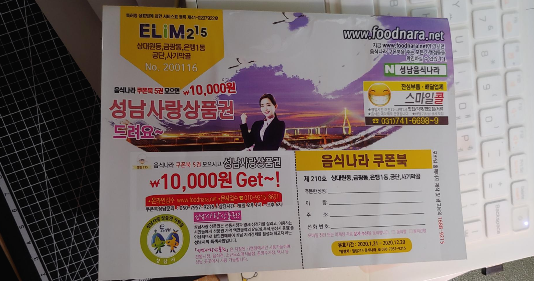 그리고 성남 음식나라에 가입된 가게여서 배달시 쿠폰북을 받을 수 있고 이걸 다섯 권 (같은 쿠폰북일 경우에는 열 권) 모으면 성남사랑 상품권 10,000원권을 받을 수 있습니다. 지역경제 살리는 데에도 도움을 줄 수 있고 맛있는 음식도 저렴하게 먹고 좋네요 ㅎㅎ