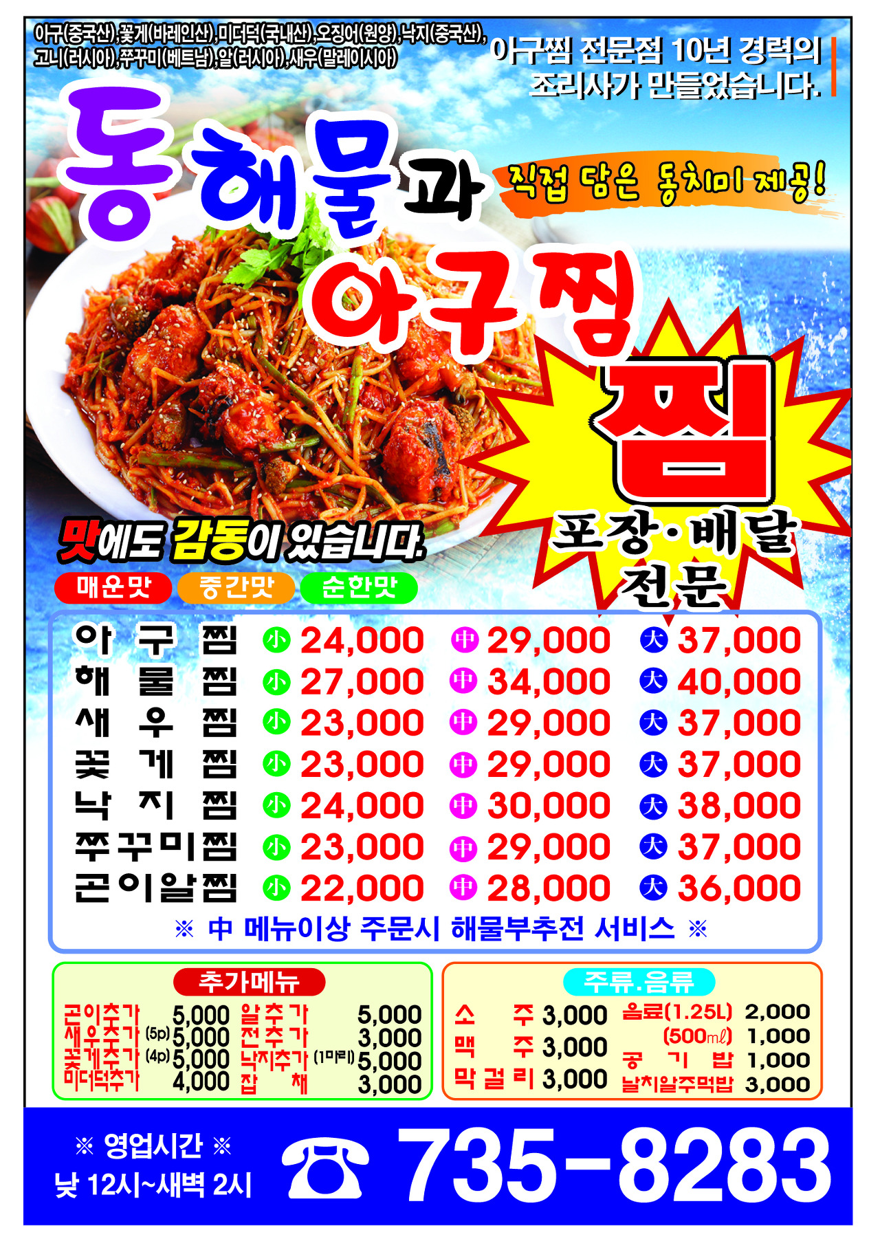 사실 저는 배달음식을 잘 시켜먹는 편은 아니고 두세 달에 한번 정도 그것도 한 곳만 이용합니다. 뭐 시켜 먹을까 엄청 고민하긴 하는데 결국 전에 먹어봤던 가장 맛있는 집에서 주문하게 되더라고요. 저의 베스트 배달음식점은 바로 단대오거리에 위치한 해물찜, 탕 전문점 <동해물과 아구찜>입니다.