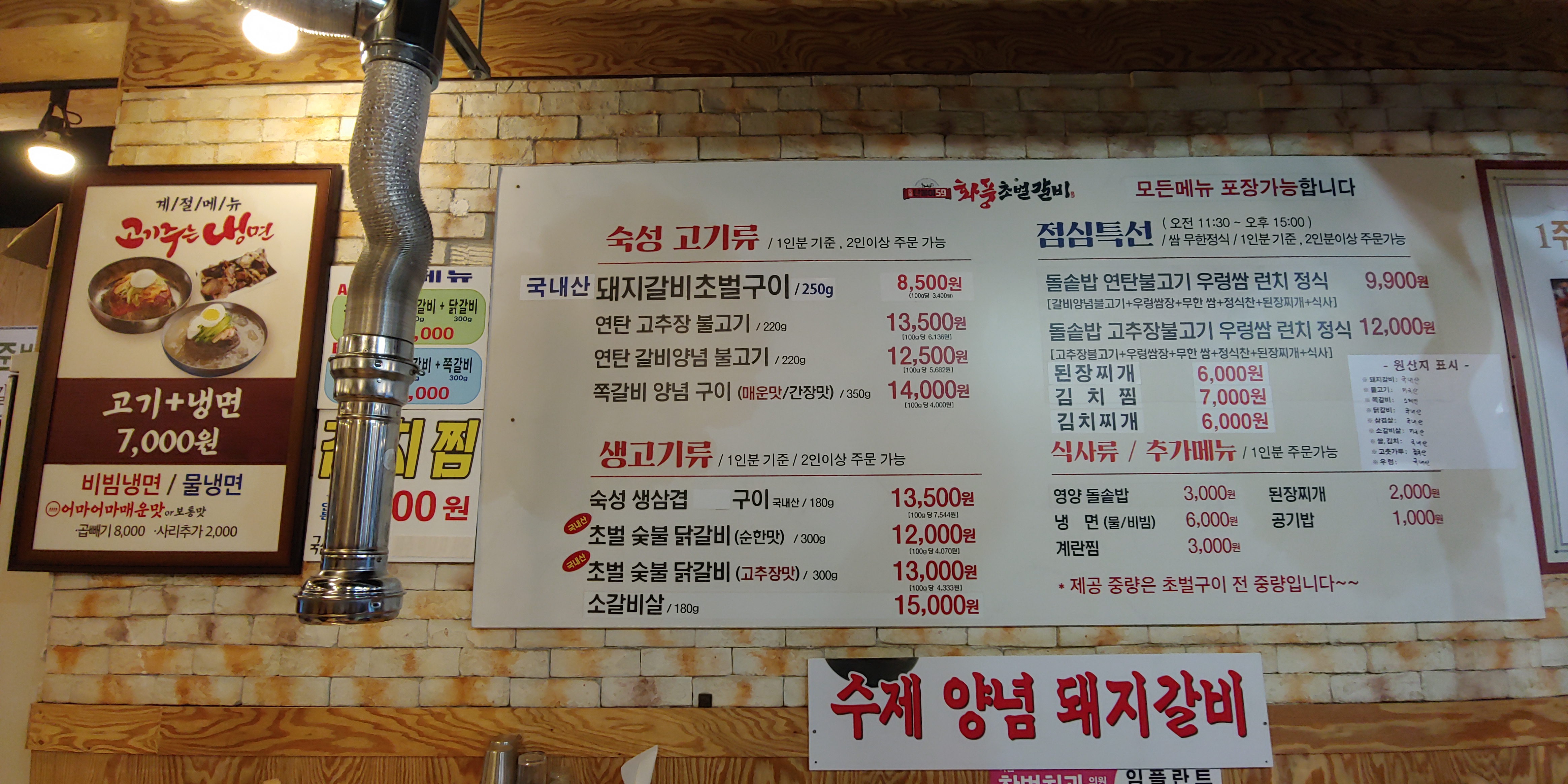 소갈비, 돼지갈비, 닭갈비를 동시에 즐길 수 있습니다. 냉면 맛 설명이 어마어마 매운맛인 거랑 점심메뉴가 이름이 엄청 긴 게 재밌지 않나요? ㅋㅋㅋ 아주 푸짐해 보이는 것이 강력하게 끌립니다.