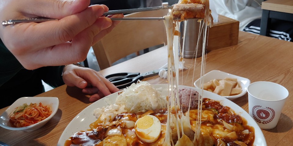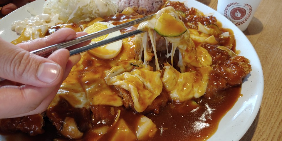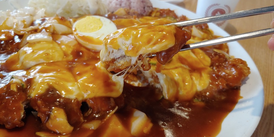 고소한 치즈가 쫙쫙 늘어나고요. 고기도 생각보다 두껍습니다. 그리고 맛있어요 ㅠ 오늘은 평소보다는 적은 것 같은데 소스에 채소들 큼직하게 많이 들어가 있어요. 식감도 좋고 샐러드에도 양파, 사과향이 은은하게 나서 돈가스와의 조화가 아주 좋습니다.
