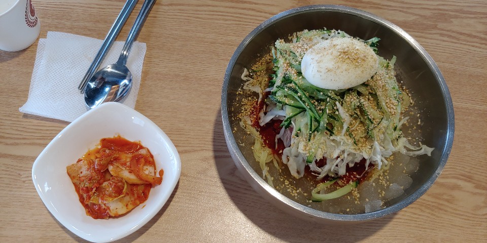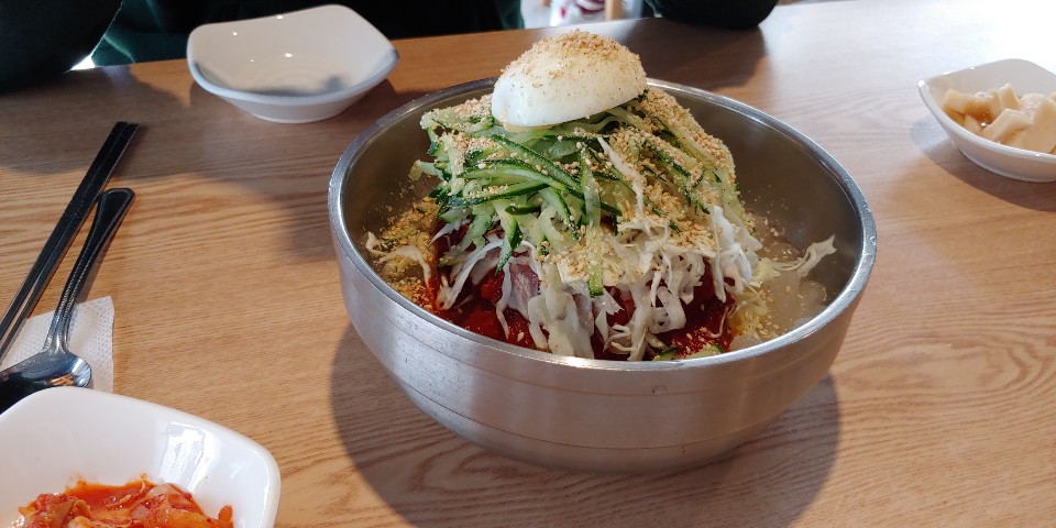 제 최애 메뉴 물비빔국수예요. 노란 생면이 쫄깃하고 고명으로 올라간 채소들 보이시죠ㅠ 진짜 너무 좋아요. 고명 많이 주셔서 감사해요 사장님ㅠㅠㅠ