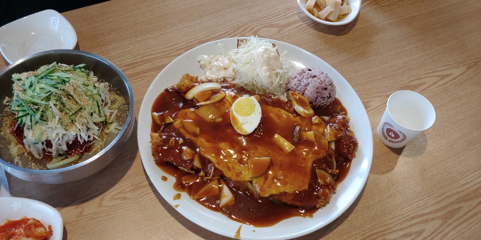 바로 얼마 전 까지는 <뚱보함박>이 있었는데 이제 돈가스만 하시나 봐요. 맛있는 집일수록 메뉴 가짓수가 단출한 곳이 많은 것 같습니다. 저는 뚱보치즈가스와 물비빔국수를 주문했습니다. 그래서 오늘은 18,000원이네요.
