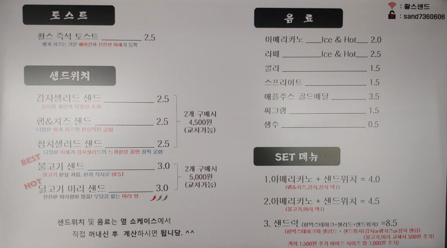 마라 샌드위치는 처음 봐요 ㅋㅋ 호기심이 살짝 들기도 했으나 감자 샐러드 샌드위치가 너무 취향저격이라 다른 건 자세히 보지도 않고 바로 주문 ㄱㄱ