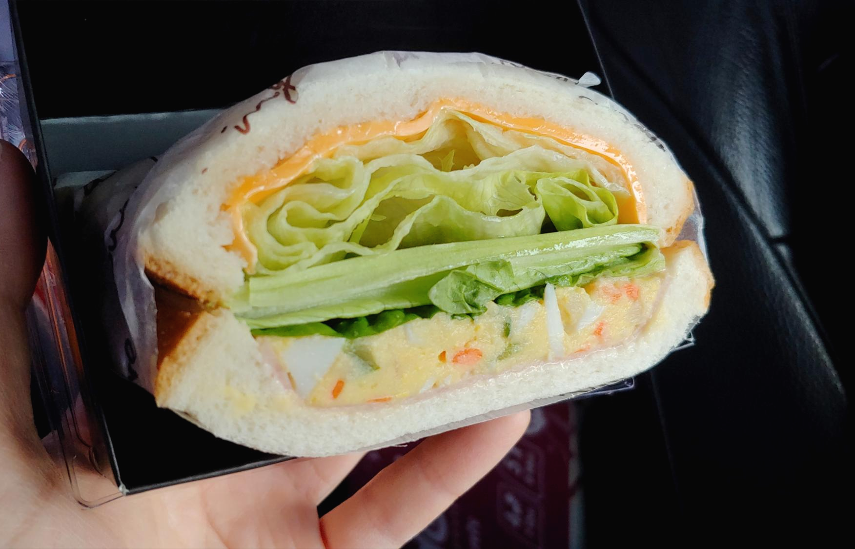 그 와중에 샌드위치 두께 실화인지; 단면 근처만 빵빵하고 가장자리는 비어있는 그런 것 아닙니다. 아주 실해요. 일단 양상추 많아서 너무 좋고 맛이 진짜 조화로워요 ㅠㅠ 홍루이젠 샌드위치 좋아하시는 분들 많잖아요? 홍루이젠의 샌드위치처럼 부담스럽지 않은 달콤한 맛이 입안에 촥 감기는데, 속재료가 홍루이젠 상위 버전인 것 같아요. ㅠㅠ 지존으로 맛있어요ㅠㅠㅠ 연유? 카야잼? 뭔지 모르겠는데 아무튼 달달한 맛이 최고입니다.