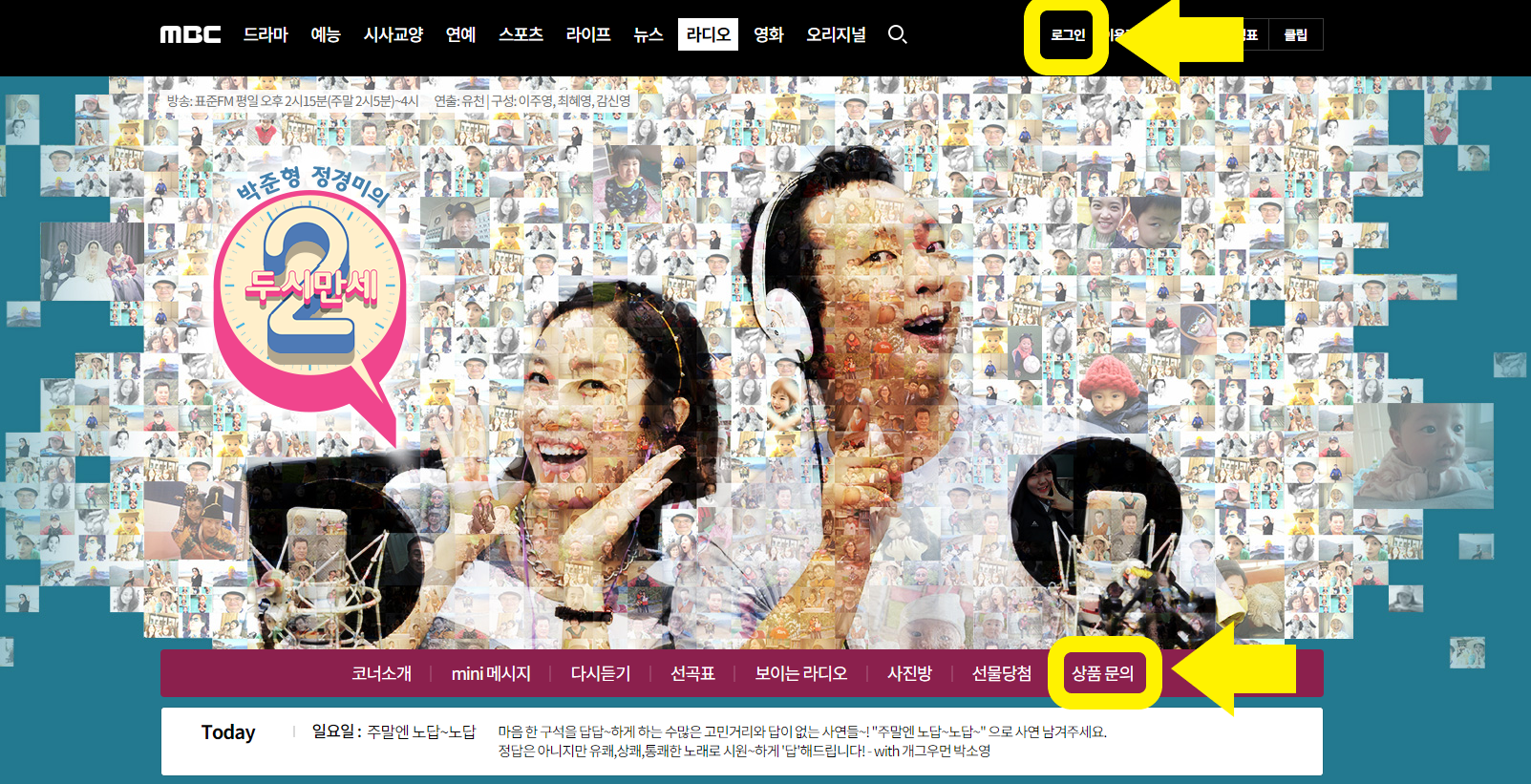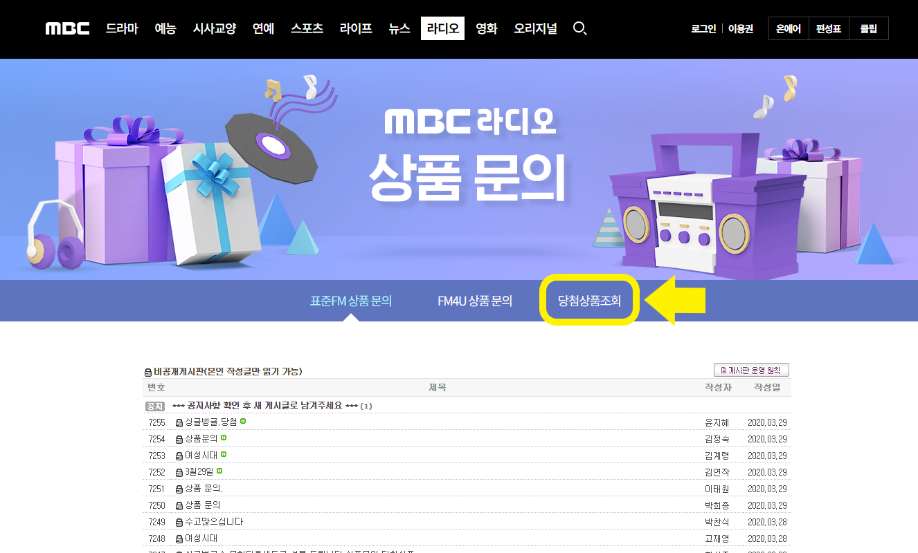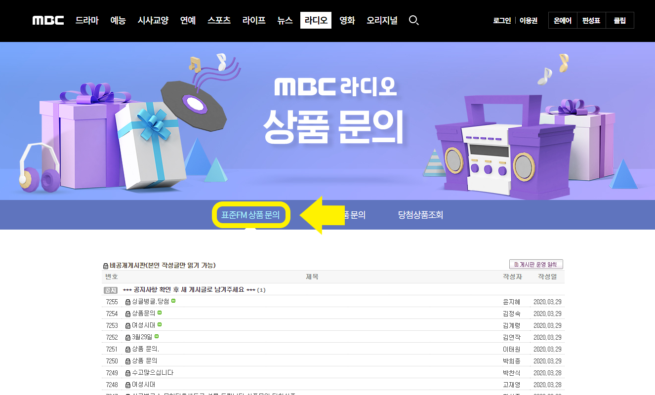 1. MBC 라디오 홈페이지에 로그인하고 <상품 문의> 코너에 들어가 주세요.