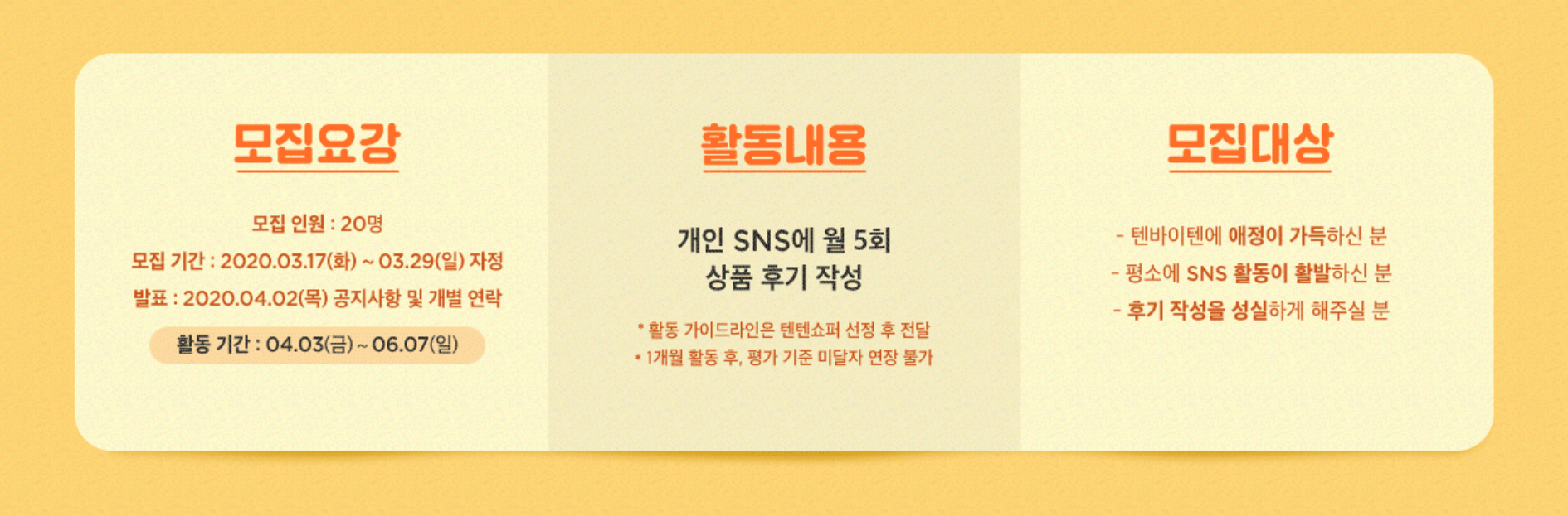 텐텐쇼퍼로 선정이 되더라도 1개월 활동 후 평가기준에 미달되면 남은 1개월 동안은 텐텐쇼퍼로 활동할 수 없고, 당연히 혜택도 받을 수 없다고 하니 성실하게 후기를 작성하는 게 무엇보다 중요하겠죠?