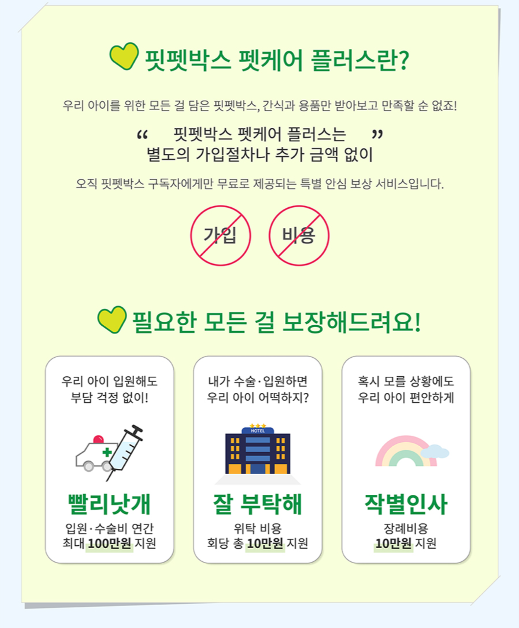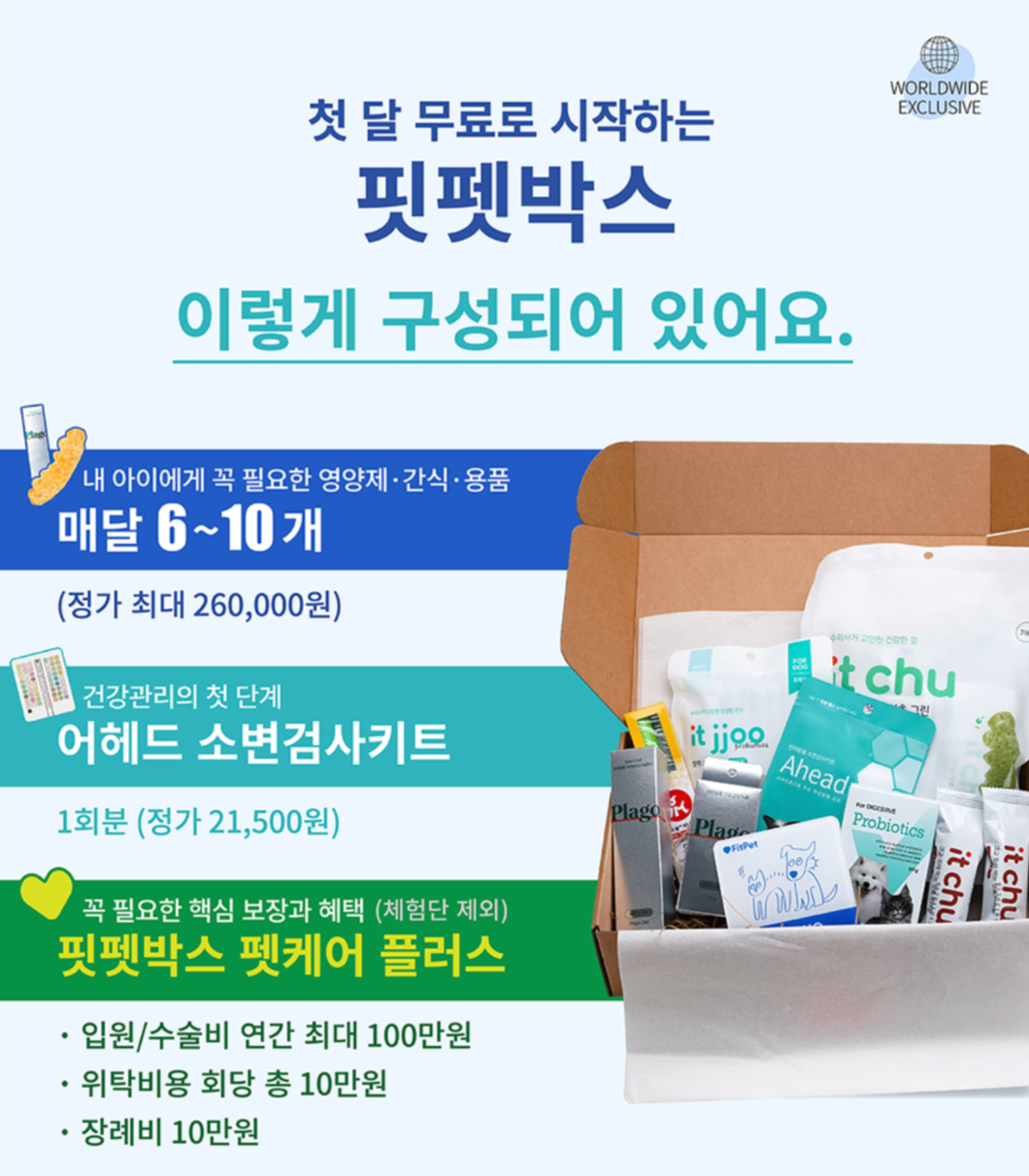 <핏펫박스>는 정가 최대 26만 원에 이르는 용품뿐만 아니라 반려동물 소변검사 키트인 어헤드를 받아볼 수 있고 입원/수술비/위탁비용/장례비까지 보장받는 세계 최초 반려동물 맞춤 케어 서비스입니다. 정기구독 플랜에 따라 전문가가 구강/ 피부/ 요로/ 관절 등의 여러 가지 요소를 복합적으로 고려하여 구성한 너무 알찬 서비스예요 ㅠ 장기 구독 가격 혜택이 어마어마합니다.✨