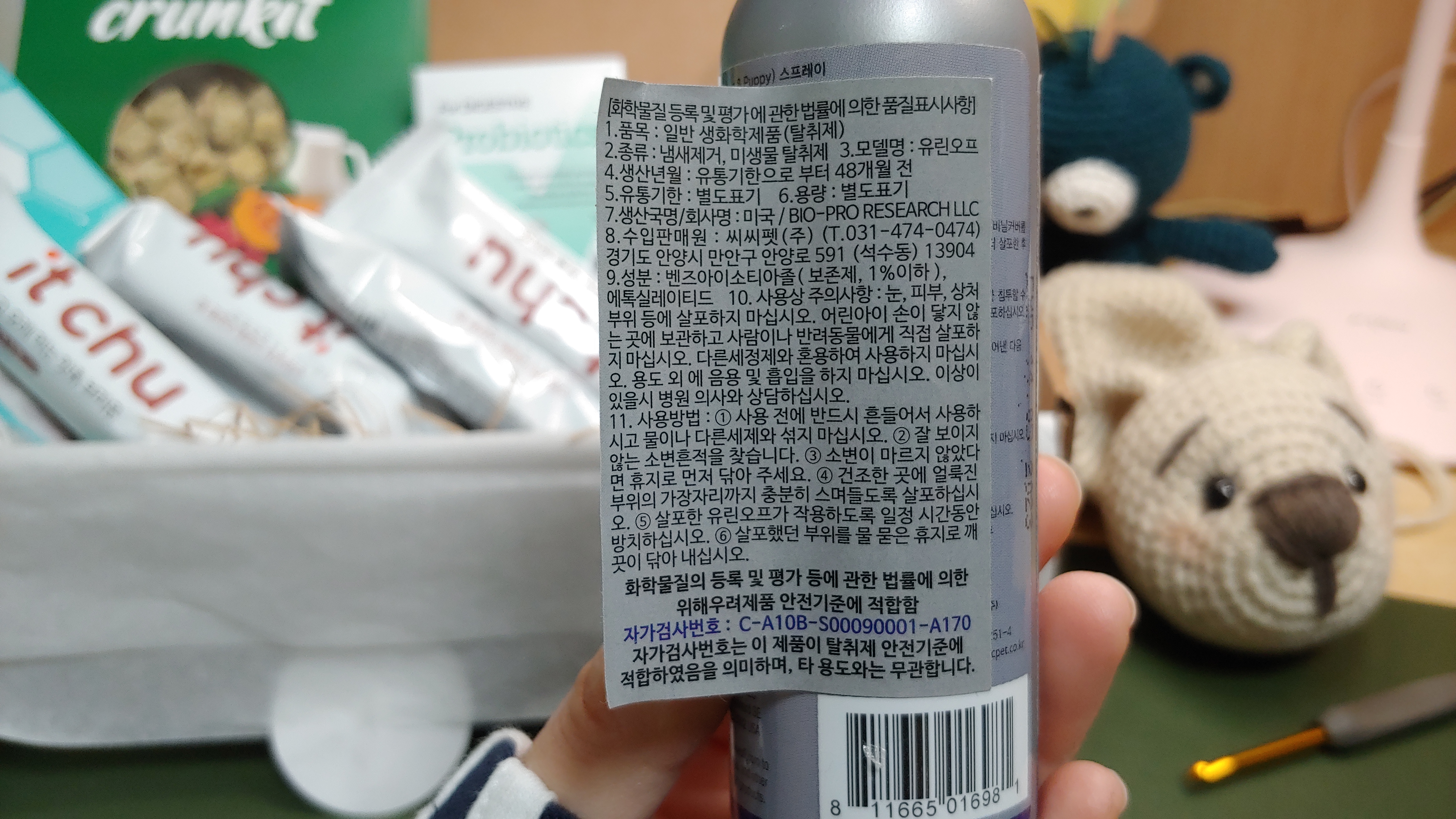 생화학 제품으로, 제품에 포함된 미생물이 반려견의 소변 등을 깨끗하게 분해해 줍니다. 박스를 열었을 때 홍이가 간식보다 이 제품에 코를 박고 그렇게 킁킁 거리던데, 기대됩니다.