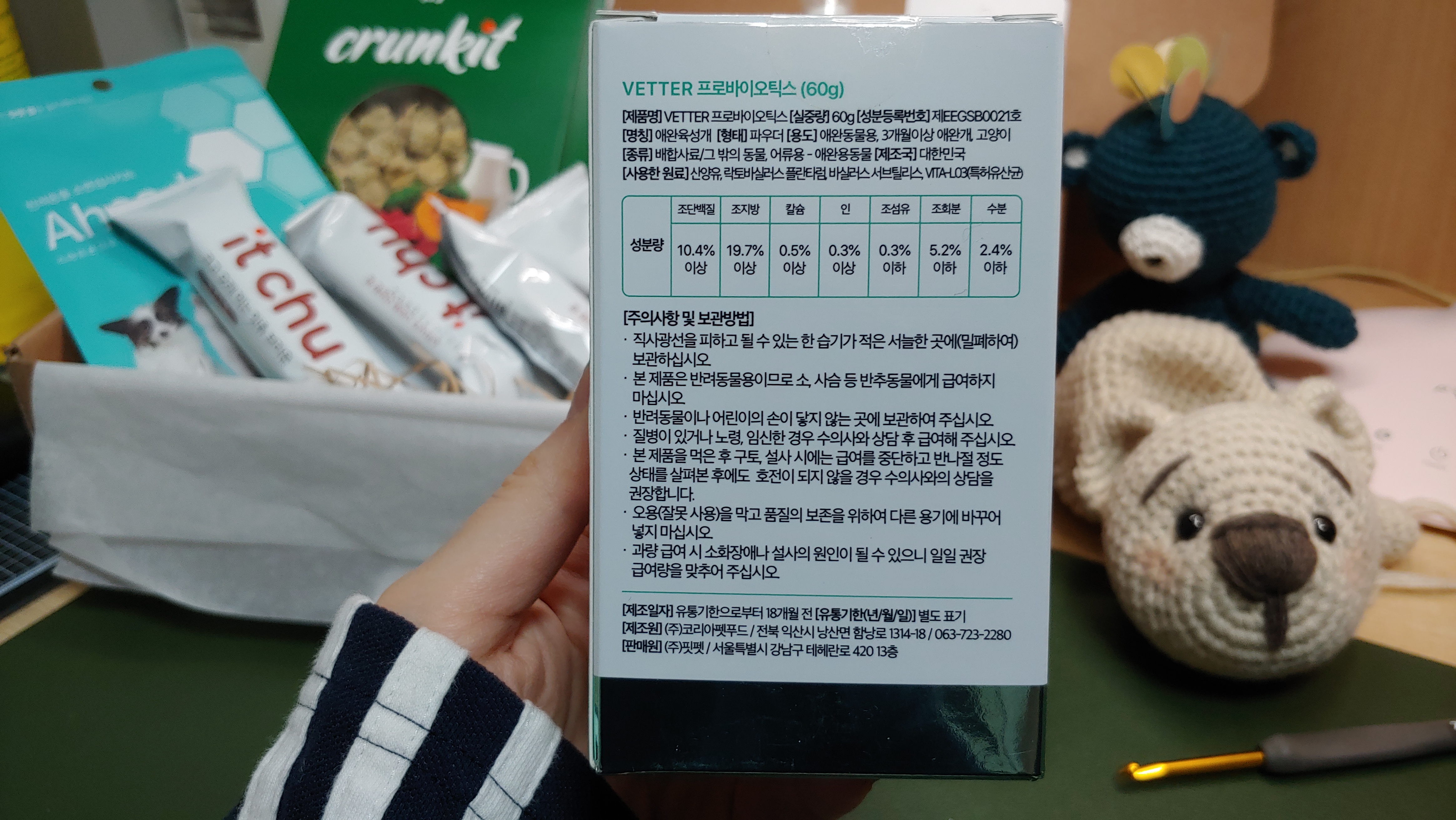 같이 동봉된 1g짜리 계량스푼으로 하루에 두 스푼씩 급여하면 됩니다. 총 60g이니 딱 한 달 분량이네요. 성분은 사진을 참고해주세요!