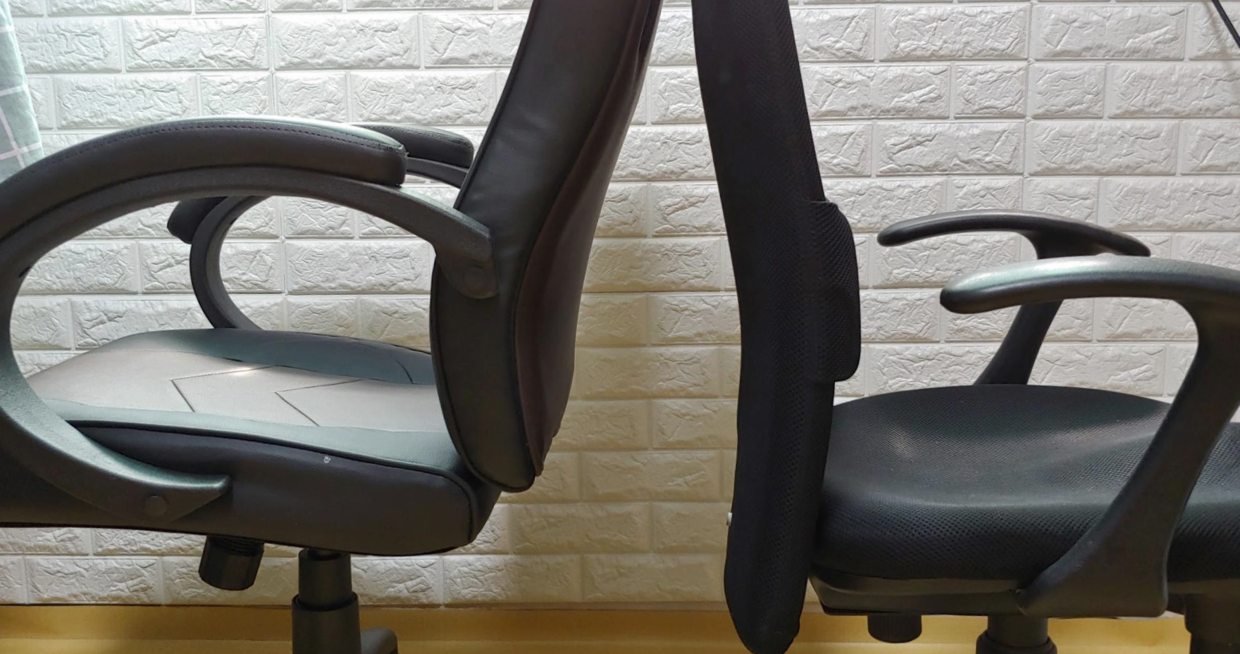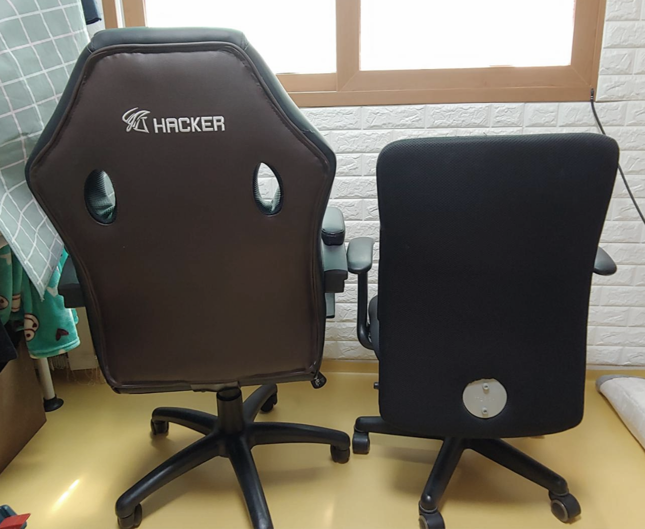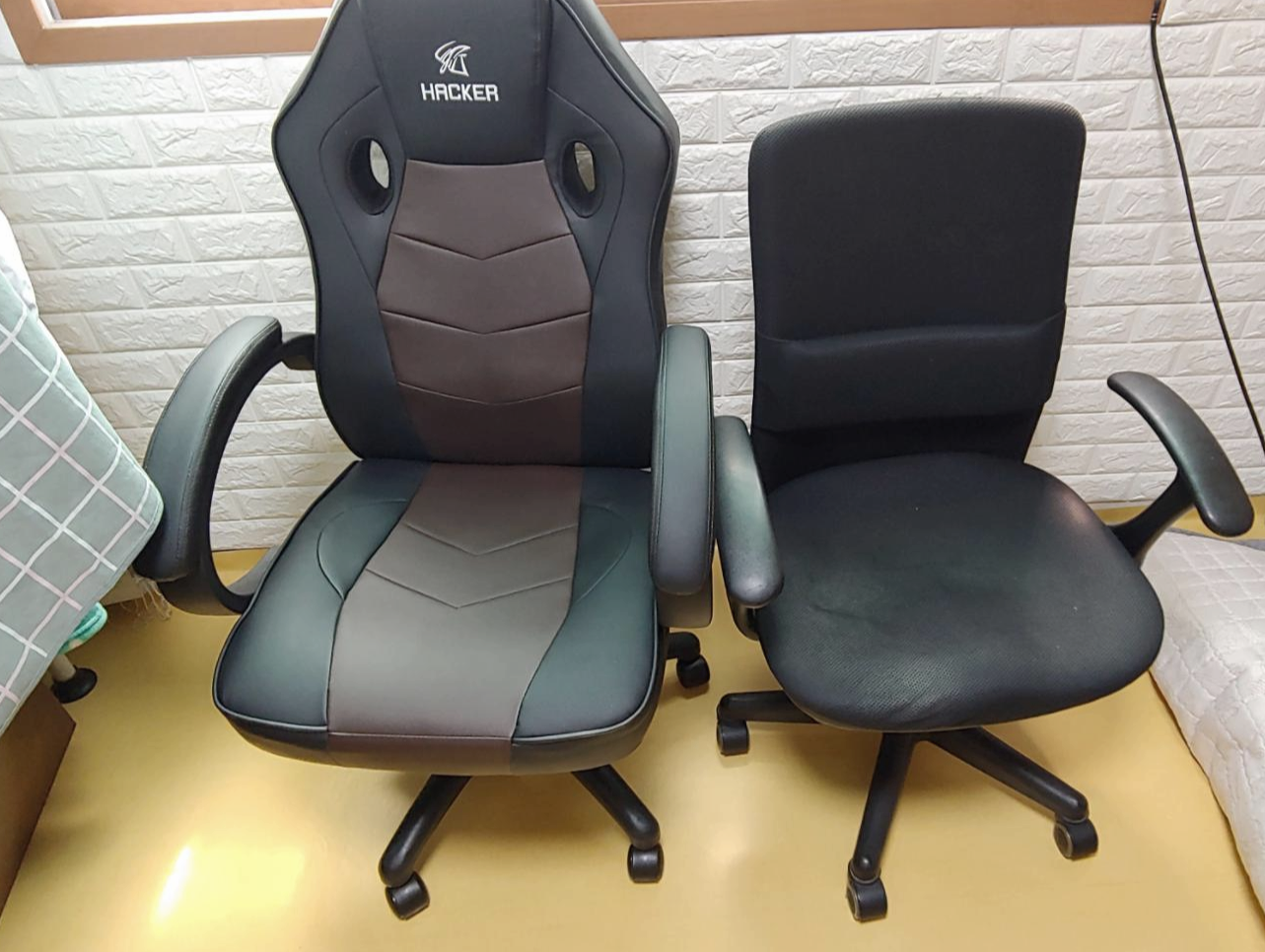 오른쪽은 기존에 쓰던 일반 사무용 의자인데요, 옆에 나란히 놓으니 이번에 산 게 더 돋보이네요.